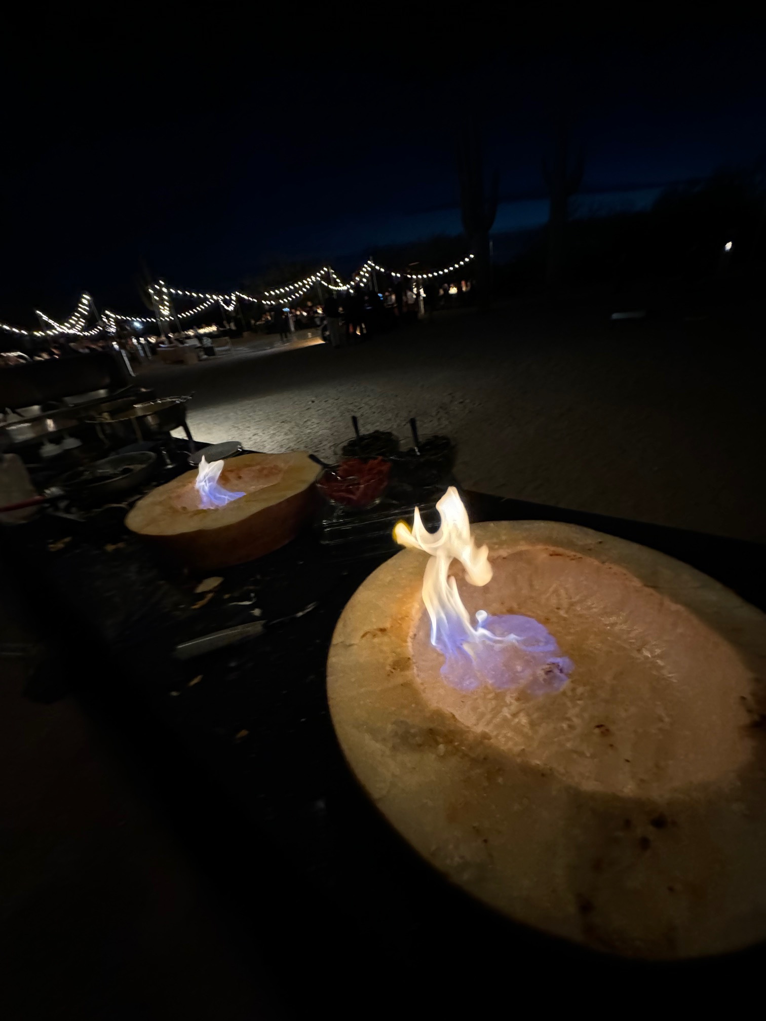 Live cooking stations are a highlight of many catered events, adding an element of excitement and engagement that traditional serving methods cannot replicate. These stations allow chefs to prepare food right in front of the guests, showcasing their skills and culinary expertise. This transparency not only creates a vibrant atmosphere but also builds trust in the quality and freshness of the food. Guests enjoy being part of the cooking process, as they can see their meals being made from scratch, which enhances their overall experience. We have a flaming cheese wheel station!