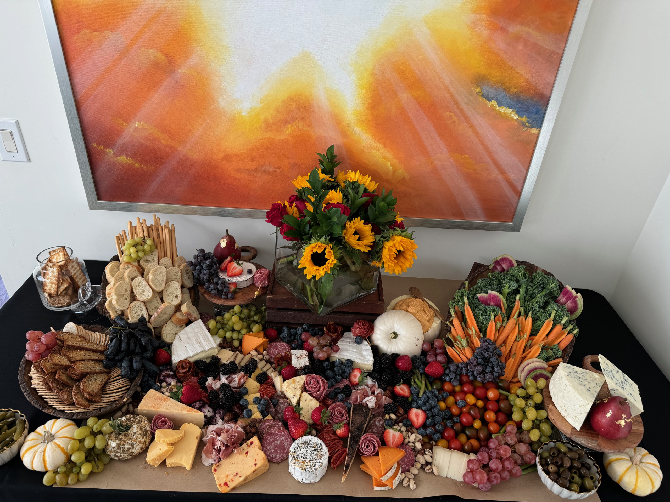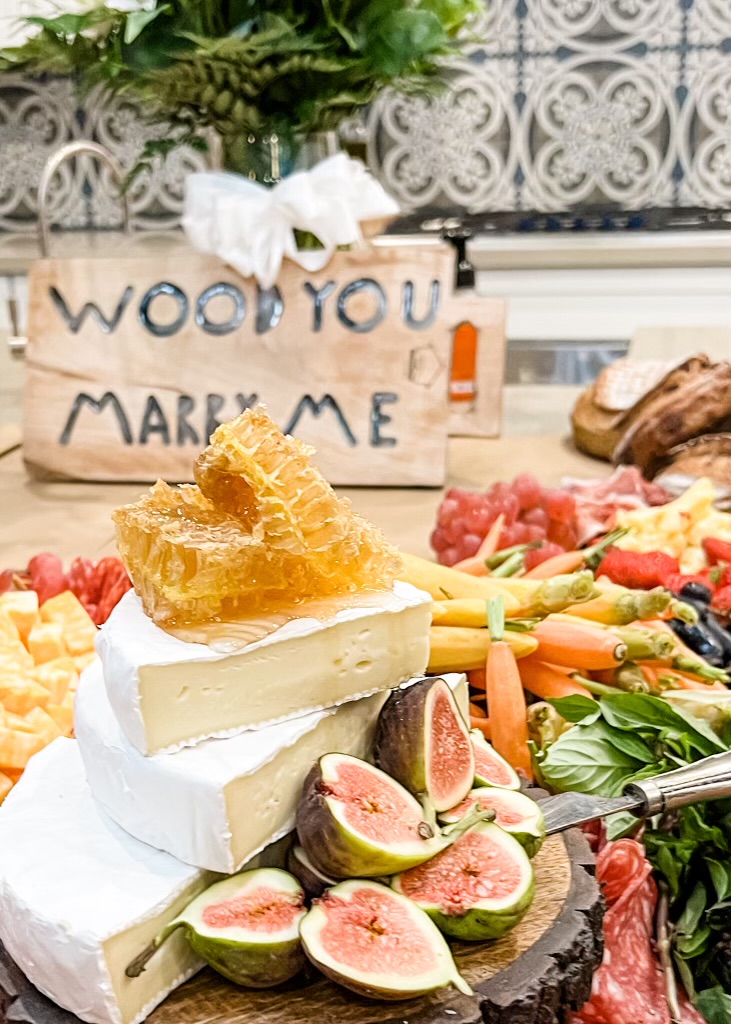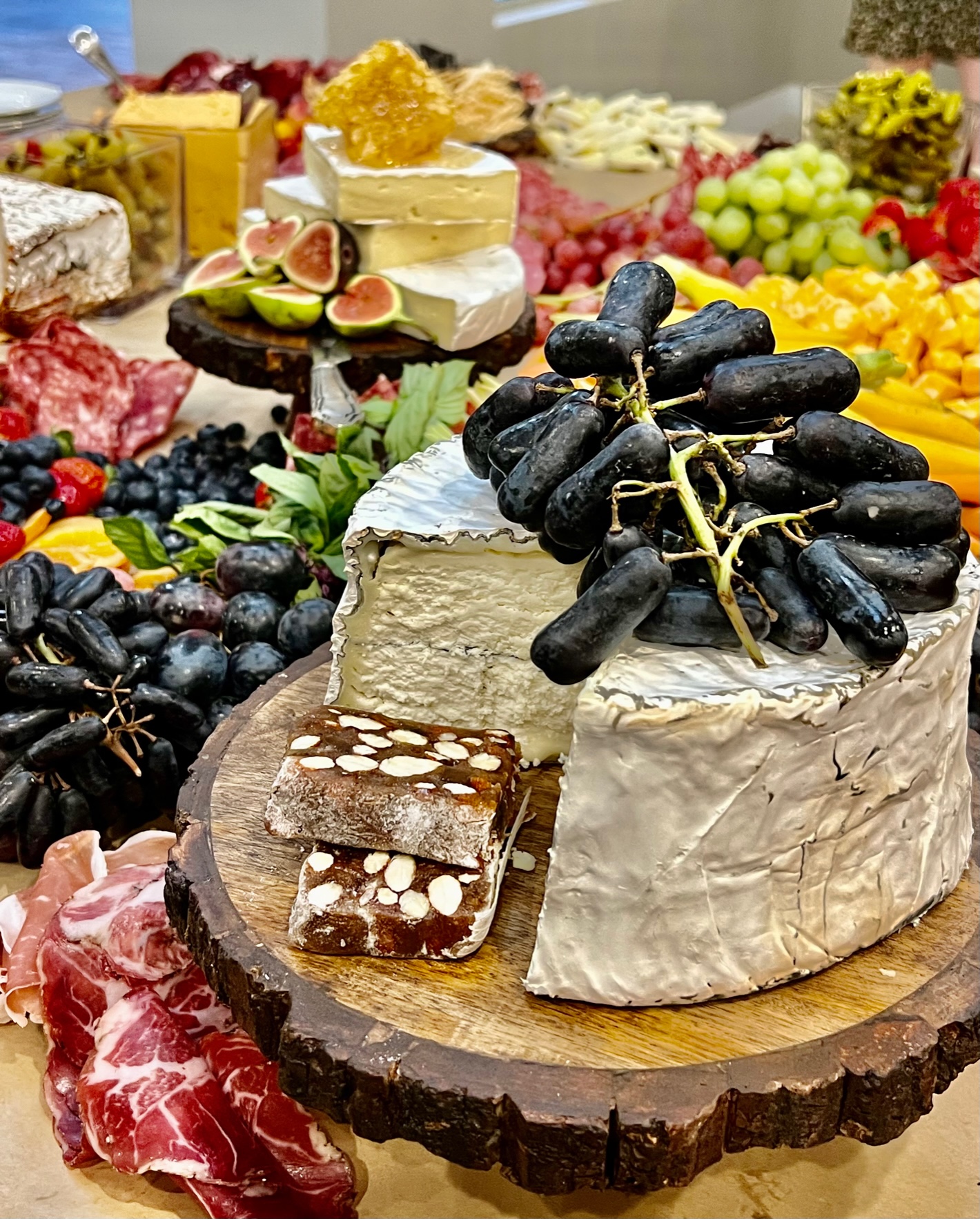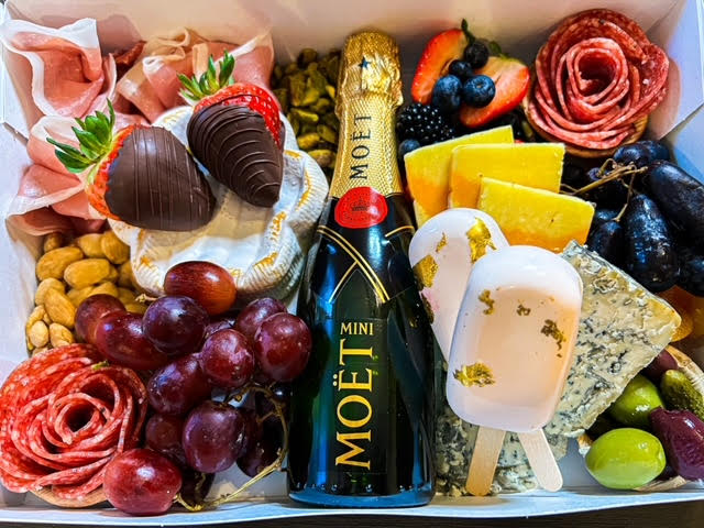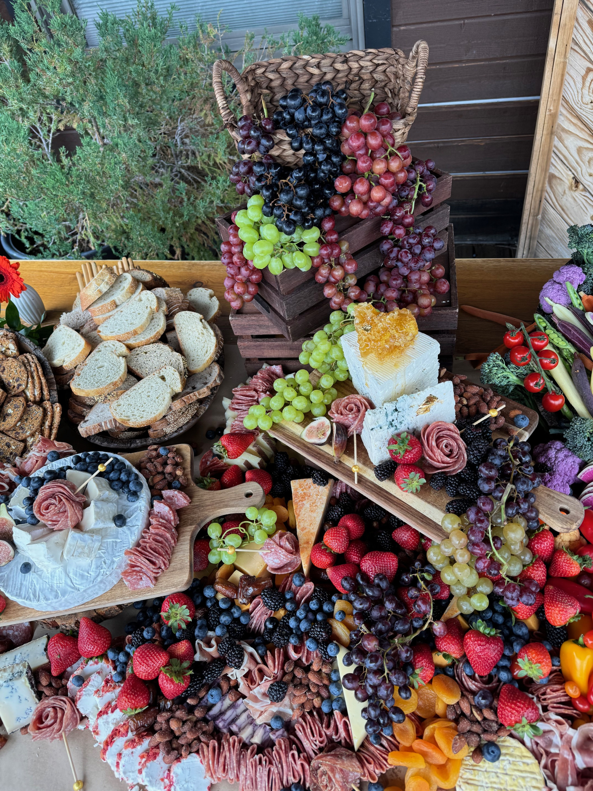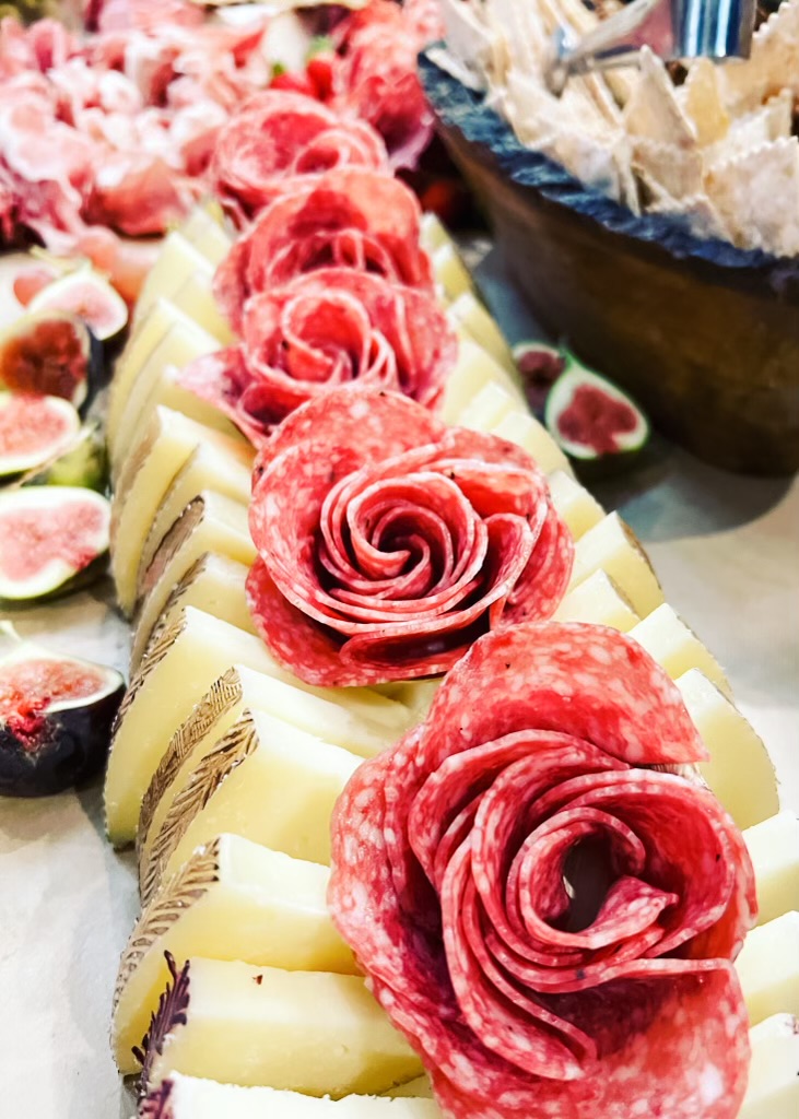 Our grazing and charcuterie tables are decadent and beautifully presented. Impress guests with delicious charcuterie. The grazing table comes with charcuterie, cheese, fruit, nuts, dried fruit, veggies, hummus, crackers, breads and more! Please let us know if you have any questions. Any table can be made into a theme as well!