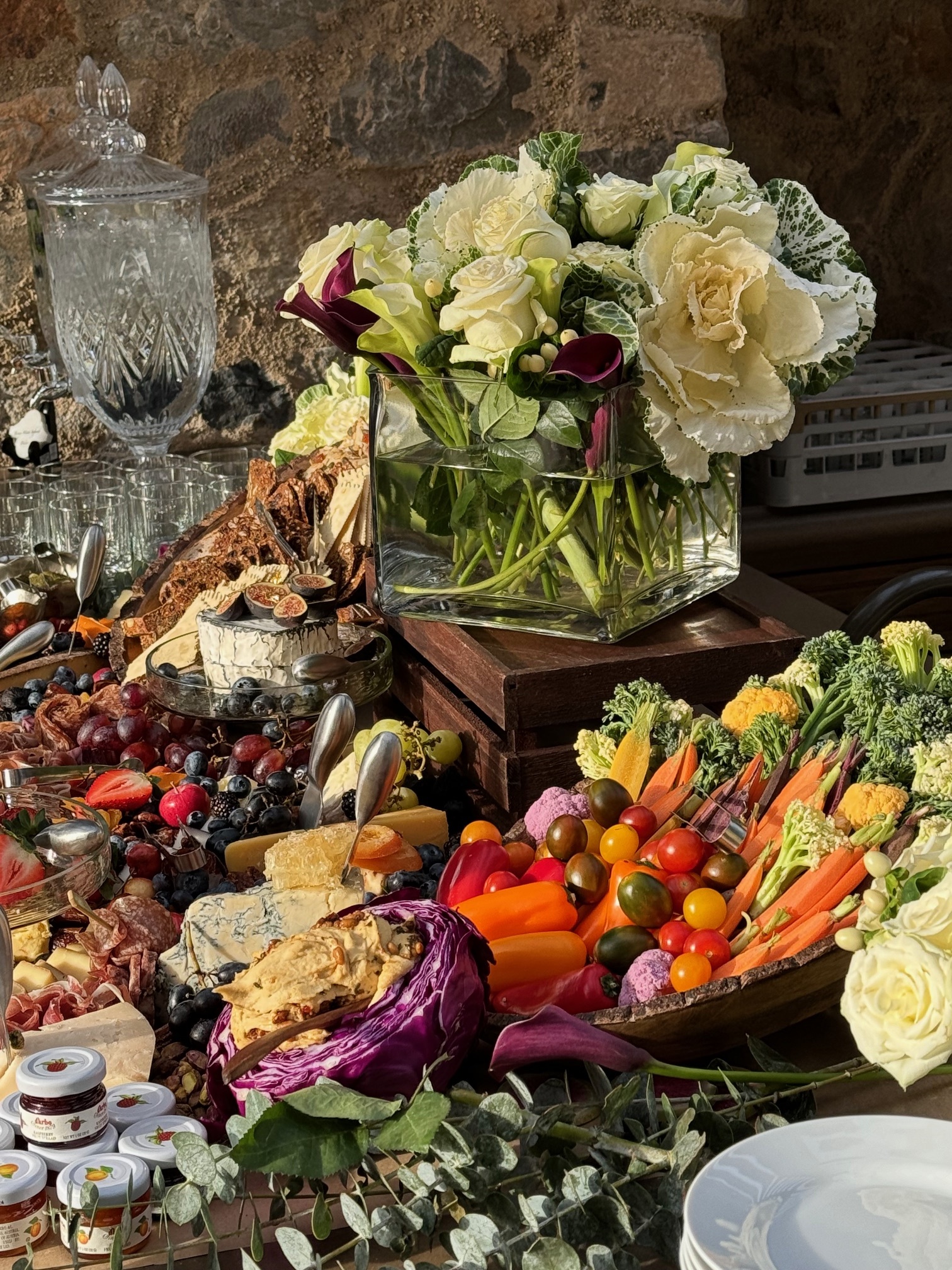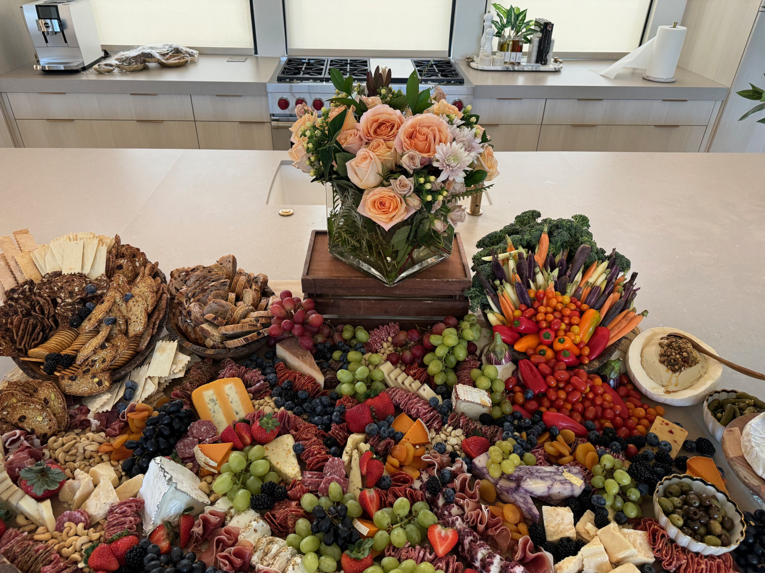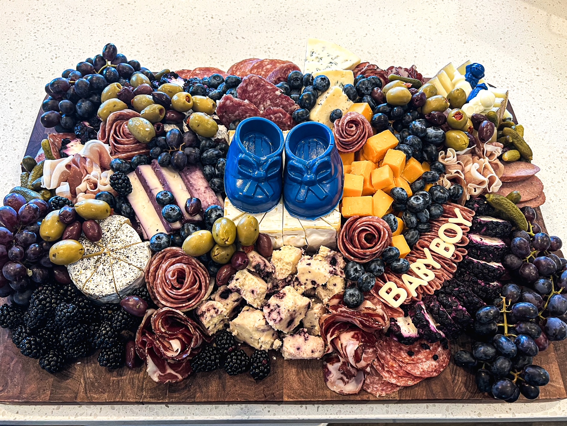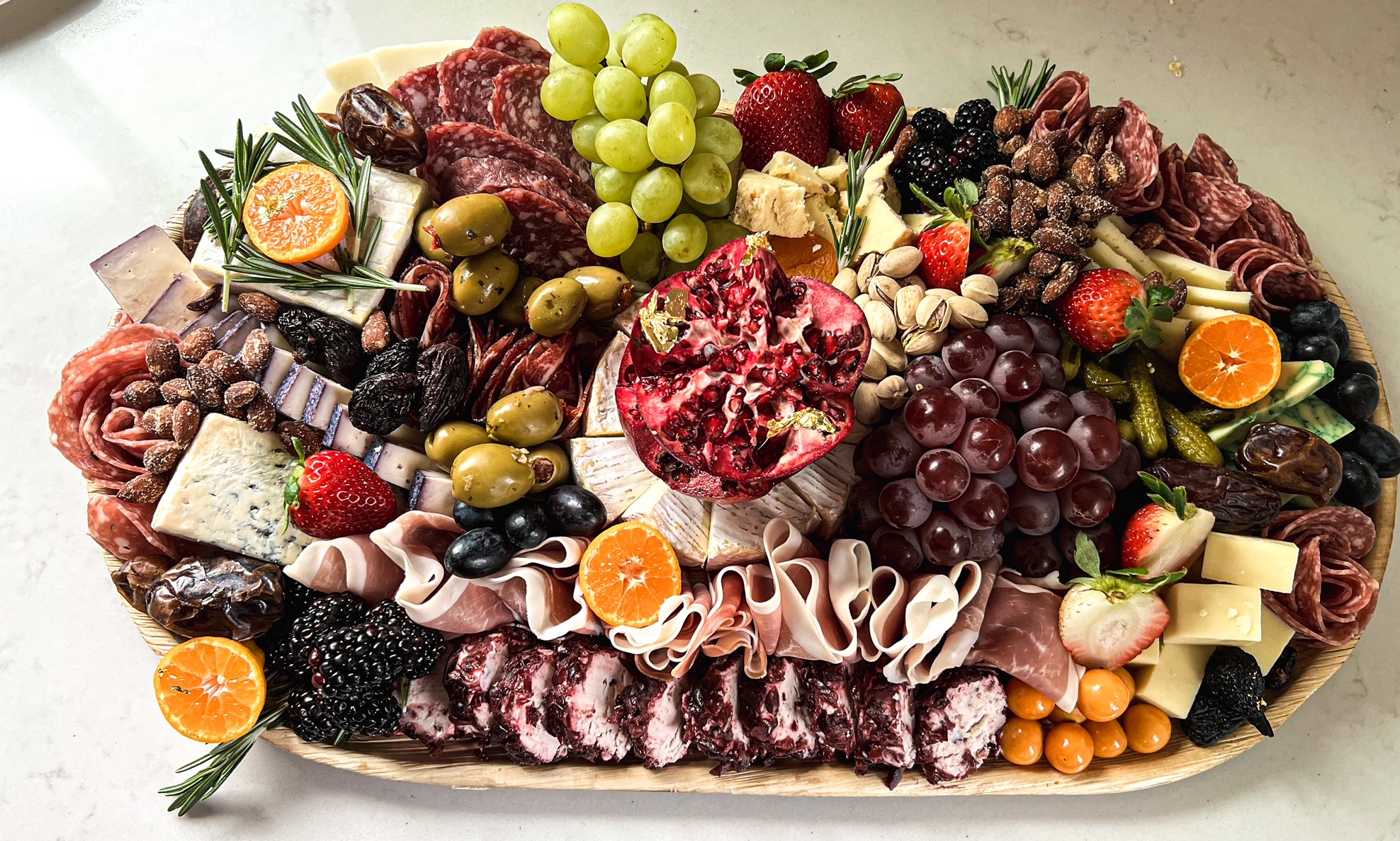 Our grazing and charcuterie tables are decadent and beautifully presented. Impress guests with delicious charcuterie. The grazing table comes with charcuterie, cheese, fruit, nuts, dried fruit, veggies, hummus, crackers, breads and more! Please let us know if you have any questions. Any table can be made into a theme as well!