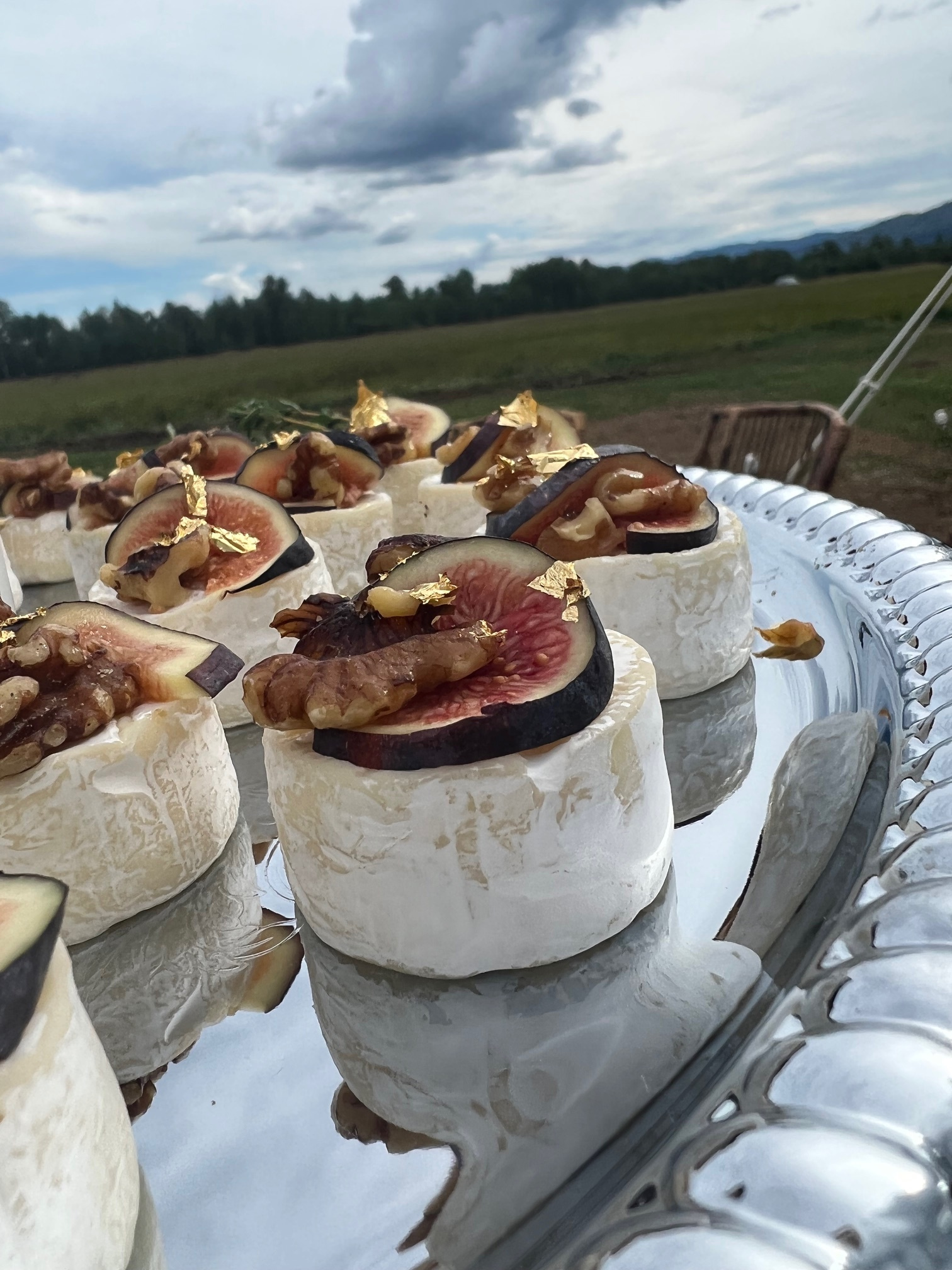 Imagine guests gathered beside the pond at golden hour, sipping champagne and signature cocktails as servers circulate with trays of exquisite hors d’oeuvres warm crostini topped with whipped ricotta, honey, and toasted pistachios, mini wellingtons. The atmosphere feels effortless, each flavor designed to complement the mountain air and the light across the valley.