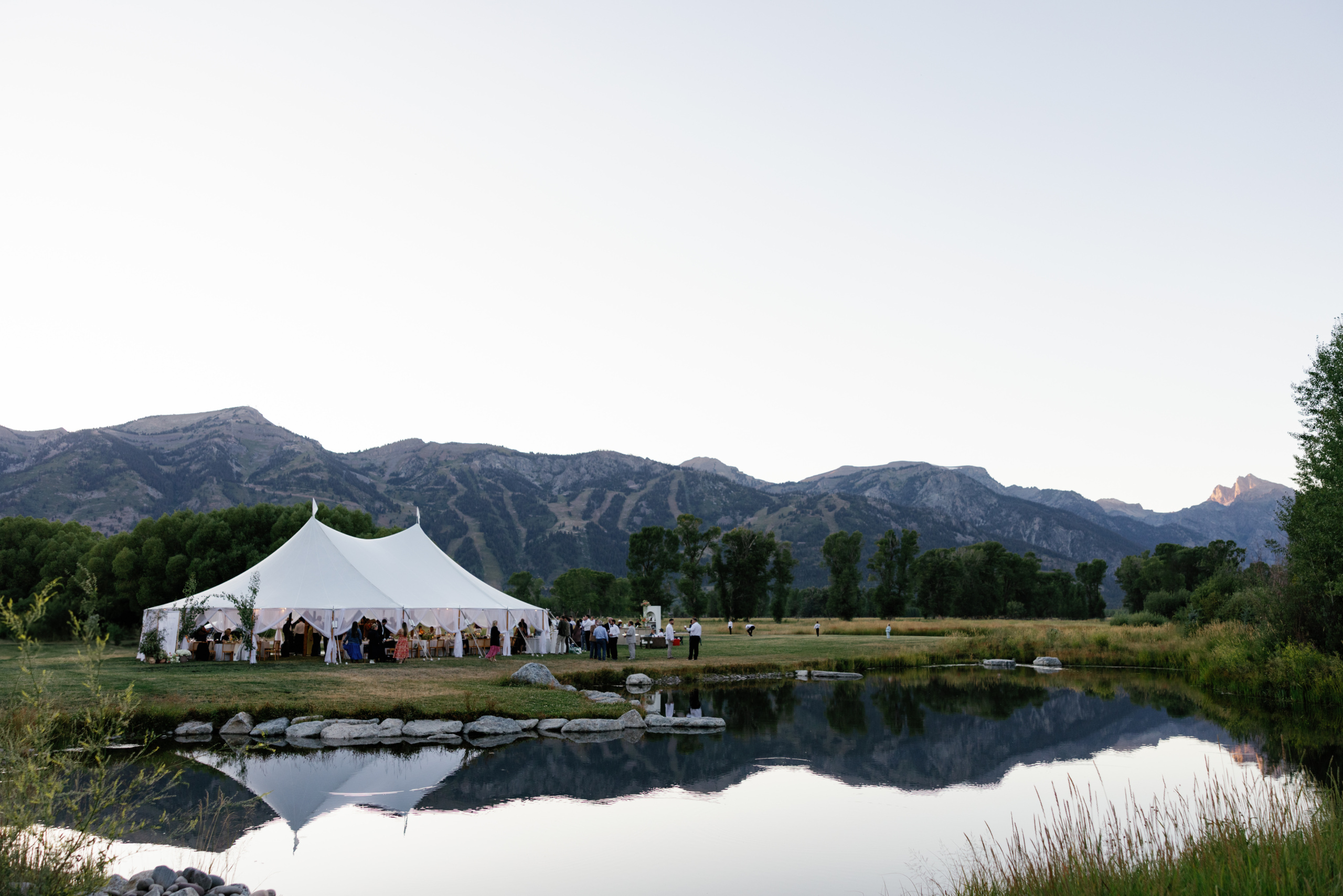 Framed by a grove of aspens, the Johnson 40 ceremony site opens to a panoramic view of the Grand Tetons. Guests cross a wooden bridge over Lake Creek to reach a meadow where a serene pond reflects the peaks and sky. It’s a setting that feels cinematic and deeply romantic, perfect for tented receptions and candlelit dinners beneath the stars.