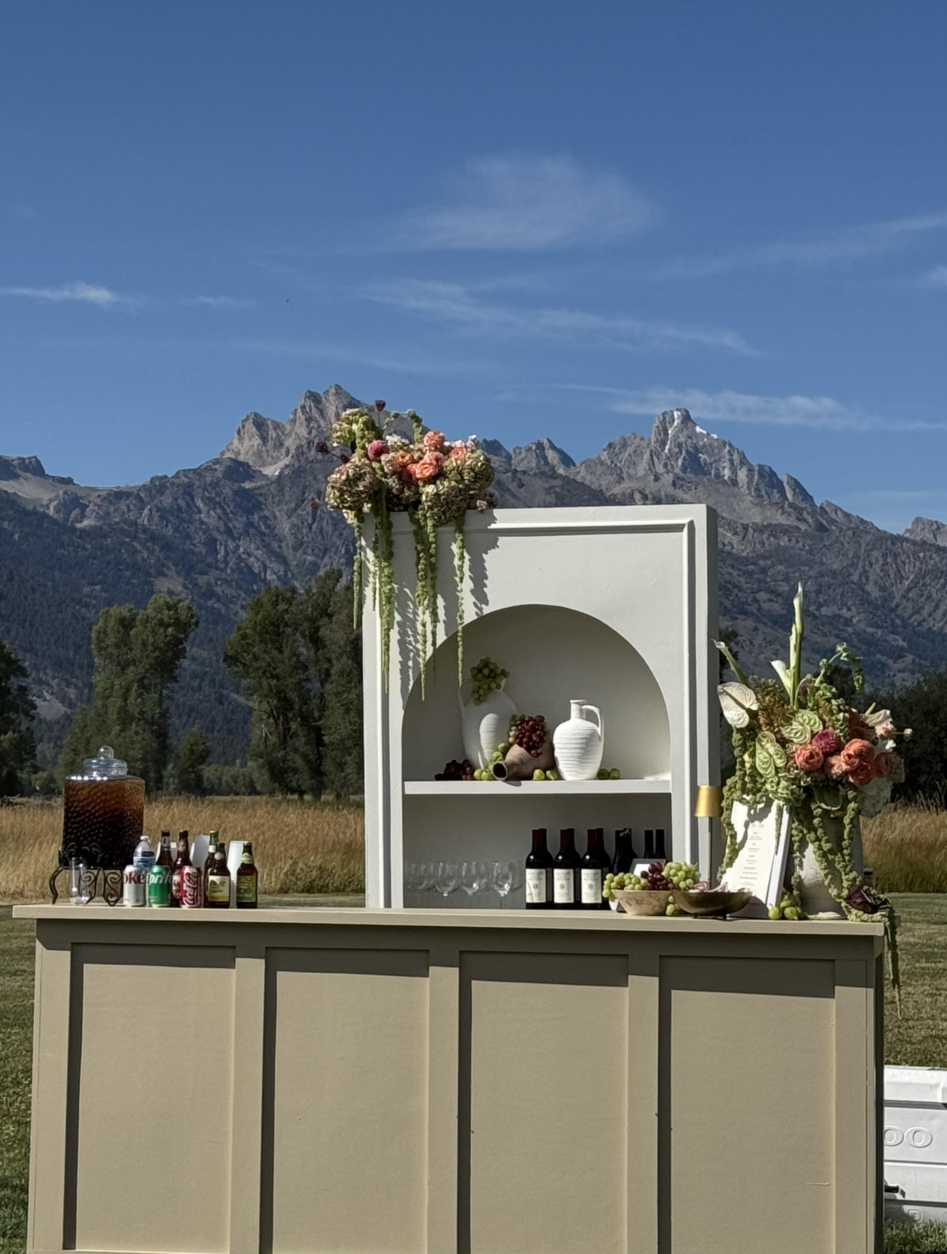 Dinner unfolds as a celebration of flavor and place. Charbroiled beef filet finished with herb jus, pan-seared halibut over champagne quinoa with citrus beurre blanc, and roasted heirloom vegetables from local farms arrive in sequence, each plate presented with precision and artistry. Or perhaps you prefer regional fare like tender bison or herb-crusted venison, each dish reflecting the rugged beauty and culinary spirit of the Tetons. The menu feels distinctly Jackson Hole refined, natural, and deeply memorable. For couples who prefer a more interactive or relaxed dining experience, Contessa Catering also specializes in elegant family-style dinners, refined ranch barbecues, and chef-led food stations. Guests can share abundant platters passed at the table, enjoy artisan grilled selections prepared over open flame, or explore curated stations featuring regional favorites and seasonal pairings. Each format is designed to create connection, conversation, and a sense of celebration that feels both luxurious and welcoming.